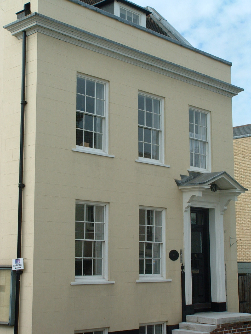 Also on this floor is a server room, WC, kitchenette, meter storage cupboards, water and central heating boiler and drying cupboard. Access is from the car park at the rear, or from the front via the splendid Queen Anne door case and door on raised Portland stone steps. There is a fine cornice under the front parapet wall with short flank returns.